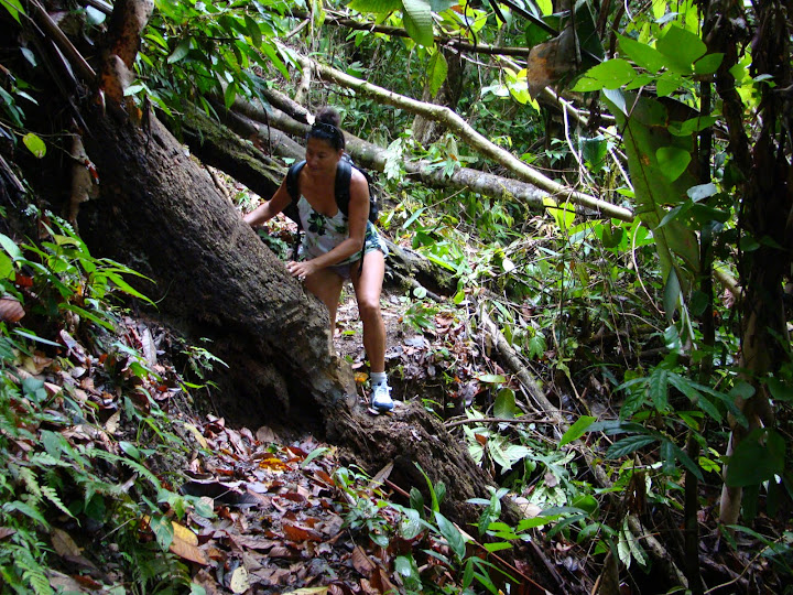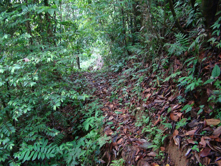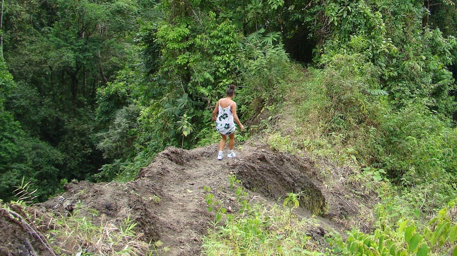 We were soon heading down the leaf strewn path, Helen havin switched her flip flops for trainers/sneakers. While the path was littered with obstacles which had to be negotiated it was clear that this was a maintained trail. Fallen trees had chips cut out for footholds and collapsed areas had freshly cut paths (albeit incredibly narrow at times) cut into the slopes we tried our best not to fall down (as in the beginning of Romancing the Stone).