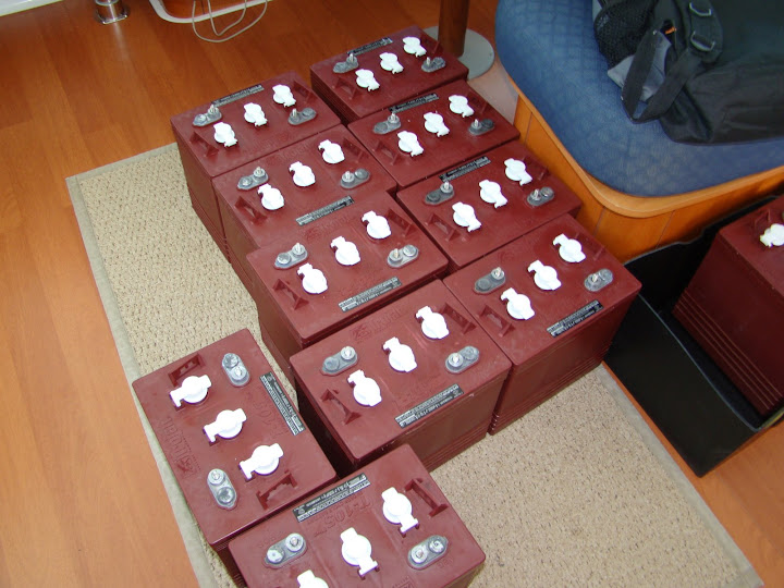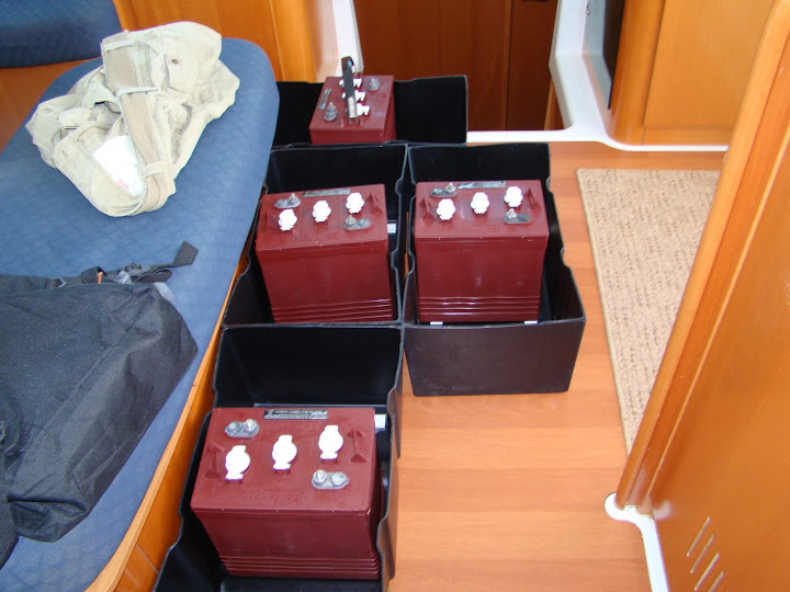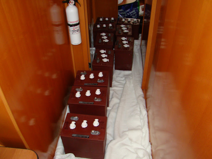 This morning the weather looks fine. We need to goad ourselves into getting to work on the starboard side drive bank. The plan today is to remove the battery cabling, lift out the six 8D batteries and remove the boxes and all straps and dowels. We’ll then clean up the locker before redoing the dowels and straps and putting some wood filler to cover some burn marks left by some welding that was done before Dignity was originally delivered. If the wood filler sets sufficiently we’ll place another 12 of the 6V batteries into the boxes ready for cabling tomorrow. We still ache so we’re not looking forward to this work at all.
