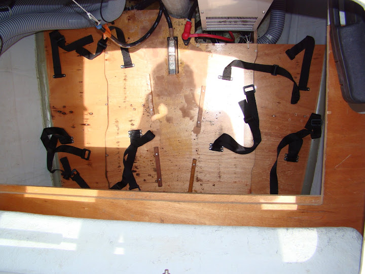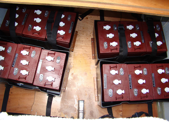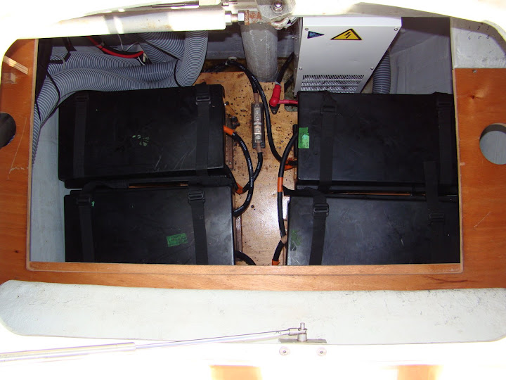 This morning the weather looks fine. We need to goad ourselves into getting to work on the starboard side drive bank. The plan today is to remove the battery cabling, lift out the six 8D batteries and remove the boxes and all straps and dowels. We’ll then clean up the locker before redoing the dowels and straps and putting some wood filler to cover some burn marks left by some welding that was done before Dignity was originally delivered. If the wood filler sets sufficiently we’ll place another 12 of the 6V batteries into the boxes ready for cabling tomorrow. We still ache so we’re not looking forward to this work at all.