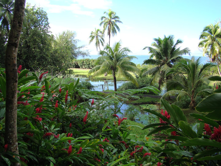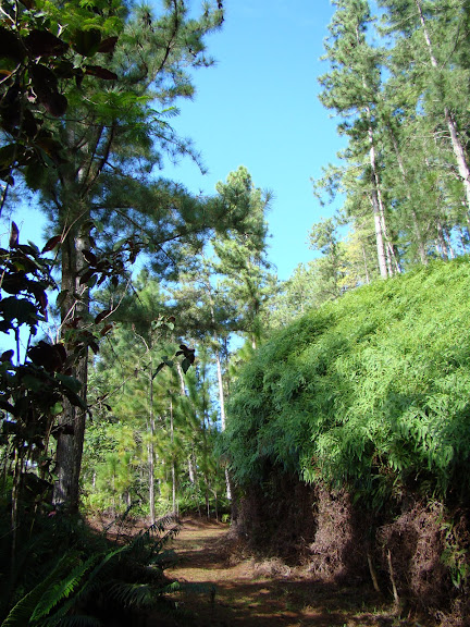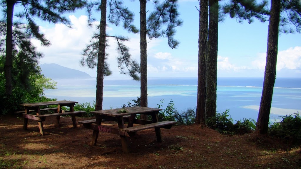 surprise. We had not expected pine forests in Tahiti. The path underfoot was soft with a bedding of pine needles and leveled out to a gentle incline. From time to time we would get excellent views of the reef outside.