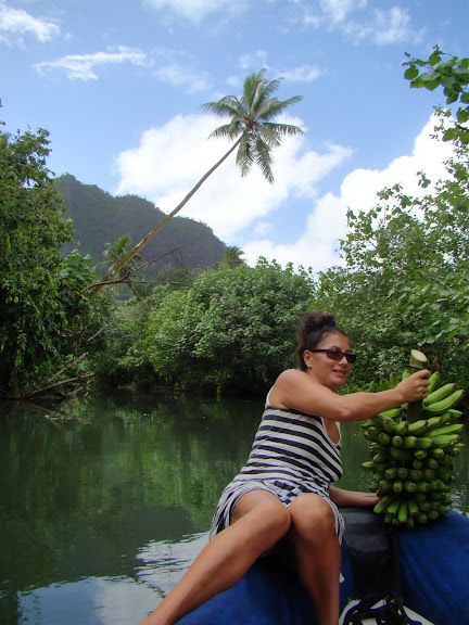 Throughout his guided tour he kept offering us bananas. When we reached the river he again offered us some and we accepted thinking we must tip him for his kindness even though it was uncustomary. The young boy and girl joined him in his skiff and they crossed the river and headed downstream a short way. James went ashore and soon came back with a big bunch of bananas. Despite our offer, he refused to accept. We thanked him in Polynesian using the words he had taught us during the tour.